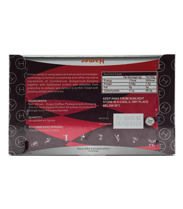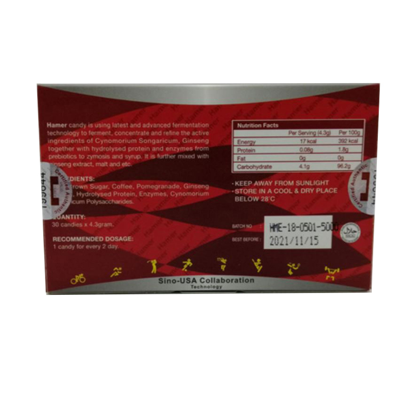 汗馬糖(Hamer candy)歷經15年研發而成,主要成分為鎖陽、人參,主要功效是補益陽氣,養筋健骨,補氣養血,緩解血虛型便秘,汗馬精力糖由於快速補充人體細胞營養,延緩老化進程非常有效,數年來已成為運動員首選的細胞營養產品。